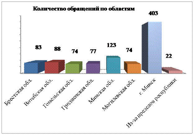 г. Минска. Наибольшее их количество приходится на г. Минск (403), Минскую (123) и Витебскую (88) области. Из-за пределов Республики Беларусь поступило 22 обращения (см. диаграмму 1).