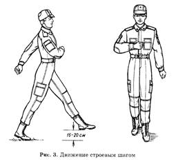 - При движении строевым шагом ногу с оттянутым вперёд носком выносить на высоту 15-20 см от земли и ставить её твёрдо на всю ступню.
