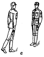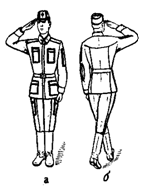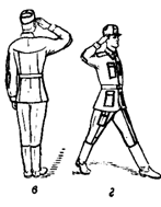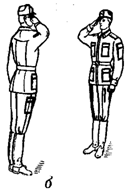 Рис. 1. Подход к начальнику: а – остановка; б – доклад | Рис. 2. Отход от начальника: а – приложить руку к головному убору, б – повернуться кругом; в – приставить ногу; г – движение в строй |