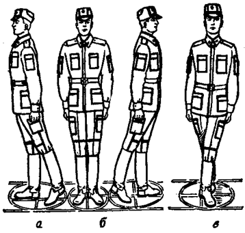 - По предварительной команде подать корпус несколько вперёд, перенести тяжесть его больше на правую ногу, сохраняя устойчивость; по исполнительной команде начать движение с левой ноги полным шагом.