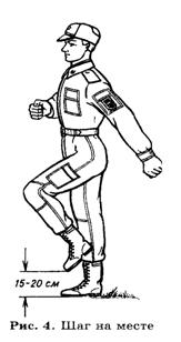 По этой команде шаг обозначать подниманием и опусканием ног, при этом ногу поднимать на 15-20 см от земли и ставить её на всю ступню, начиная с носка; руками производить движения в такт шага. По команде «ПРЯМО», подаваемой одновременно с постановкой левой ноги на землю, сделать правой ногой ещё один шаг на месте и с левой ноги начать движение полным шагом. При этом первые три шага должны быть строевыми.