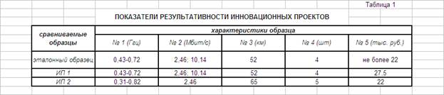 Продемонстрируем идею предлагаемого подхода на числовом примере оценки предпочтительности двух инновационных проектов (ИП. 1, ИП. 2), направленных на достижение (превышение) заданных (условных) характеристик “эталонного образца” техники, представленных в табл. 1. По сути, эта таблица содержит показатели результативности (№№ 1 - 5) конкурирующих проектов (ИП 1 – ИП 2).