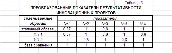 С помощью первого преобразования сделаем их значения измеряемыми количественно. Это касается показателей №№ 1, 2 в табл. 1. Для ИП 1 и эталонного образца: значение показателя № 1 заменим на (0,72-0,43))/(0,82-0,31) = 0,57; значение показателя № 2 - на 1 (достигаются оба заявленных требования). Для ИП 2 по той же логике: значение показателя № 1 заменим на (0,82-0,31))/(0,82-0,31) = 1; значение показателя № 2 - на 0,5 (достигается одно из двух заявленных требований).