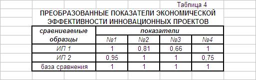 Поэтому обратимся к результативности ИП 2. Здесь ситуация для выводов не столь очевидная как в случае с ИП 1. Чтобы ее разъяснить по формуле (1), в которой вместо девяти показателей будут участвовать только пять (из табл. 3), рассчитаем, применяя ту же последовательность шагов, что и выше, индексы результативности для ИП 2 и эталонного образца. Их значения соответственно: 0,79 и 0,82. Это означает, что инновационный продукт, создаваемый в результате реализации второго инновационного проекта, уступает по своим характеристикам эталонному образцу.