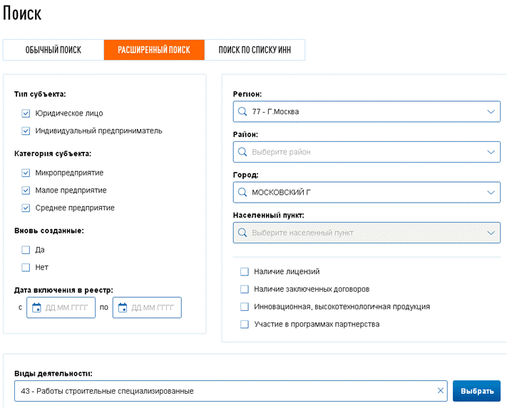 Единый реестр субъектов малого и среднего предпринимательства можно использовать для поиска потенциальных клиентов или поставщиков. Для этого используйте расширенный поиск и сделайте выборку по видам деятельности или продукции.