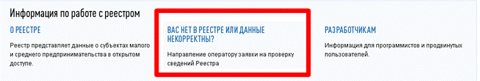 Если вы не нашли свою компанию или в реестре ошибка, отправьте налоговикам заявку на проверку сведений. Для этого выберите пункт «Вас нет в реестре или данные не корректны» внизу страницы, в разделе «Информация по работе с реестром».