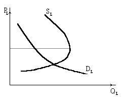 Дилемма «работа-досуг» применительно к рынку труда может быть объяснена с помощью «эффекта замещения и эффекта дохода» рассмотренного в теме теория потребительского поведения. Действие данных эффектов можно продемонстрировать на графике со своеобразным наклоном полого поднимающейся кривой предложения труда (рис.2.42). Характерный наклон кривой предложения труда SL показывает, что повышающаяся заработная плата PL стимулирует работника к труду лишь до определенного момента. В течение этого периода досуг и свободное время приносятся в жертву интересам высокого заработка (преобладание эффекта замещения). По достижении высокого материального положения и благосостояния работник приостановит дальнейшее предложение своего труда и откажется от дополнительной занятости даже при продолжающемся росте заработной платы (преобладание эффекта дохода).