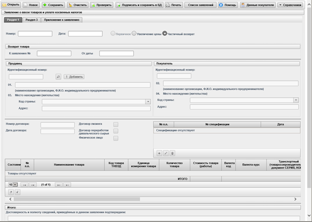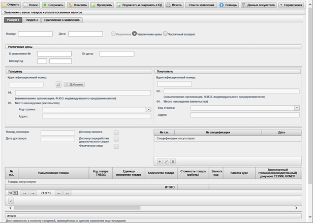 В обоих случаях будет открыта основная экранная форма "Заявление о ввозе товаров и уплате косвенных налогов", которая предоставляет возможность работы с заявлением.