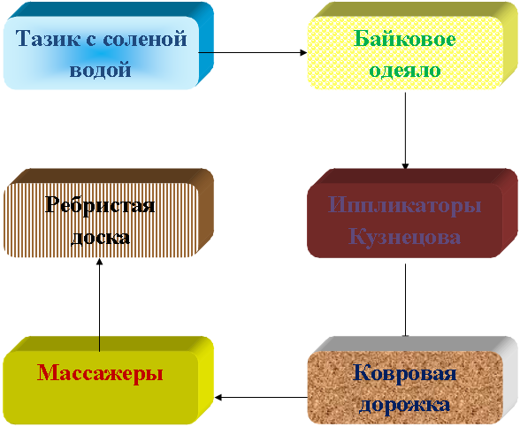Примечание: Система закаливания составляется и периодически корректируется в соответствии с изменяющимися условиями, в том числе и погодными. Она последовательна – от щадящих процедур переходит к более интенсивным. Основной принцип – постепенное расширение зоны воздействия и увеличения времени проведения закаливающей процедуры.