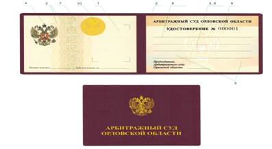 Формат удостоверения в развернутом виде – 193x67 мм; Формат каждой сторонки вы клейки — 90x62 мм Материал обложки - ледерин или кожа - цвет бордо. На обложке тиснение Герб Российской Федерации и надпись «АРБИТРАЖНЫЙ СУД ОРЛОВСКОЙ ОБЛАСТИ» в две строчки, фольга золото, высота букв 4мм Бумага: Плотностью не менее 85г/м, содержание хлопкового волокна не менее 25%; Трехтоновой водяной знак в виде ромба с размерами диагоналей 42и 25 мм, наличием трех видов защитных волокон, без фонового свечения. Защитные волокна: а) видимые - красные, синие. б) невидимые (люминесцирующие в УФ-излучении) - желто-зеленые. ГРАФИЧЕСКИЕ ЗАЩИТЫ: Способ печати - офсетный |