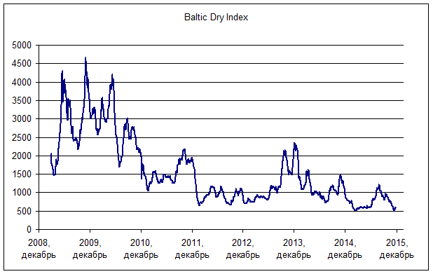 Экономическую ситуацию, сложившуюся в 2015 г. в мире, некоторые эксперты называют третьей волной мирового кризиса, другие же видят в ней признаки начала новой глобальной рецессии. Особенности третьей волны кризиса, если излагать кратко, сводятся к замедлению роста БРИКС, снижению цен на сырье и оттоку капитала с развивающихся рынков. В последние 30 лет доминировала тенденция инвестиций развитых стран в экономики развивающихся, по мере роста объемов которых росли объемы мировой торговли. С 2015 г. направленность мировых инвестиционных потоков изменилась – деньги начали возвращаться в экономики развитых стран, прежде всего в США, вследствие роста рисков на развивающихся рынках. Объемы мировой торговли сокращаются, о чем свидетельствует снижение международных грузоперевозок, оцениваемых, к примеру, на основе Baltic Dry Index (рис. 1).