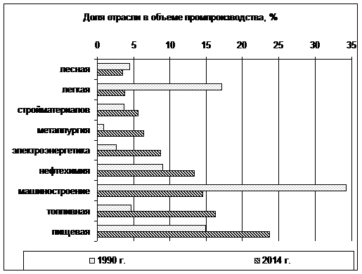 Рис. 3. Изменения в отраслевой структуре промышленности Беларуси в 1990 – 2014 гг. (источник – Белстат).