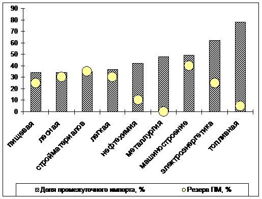 Рис. 4. «Импортоемкость» отраслей белорусской промышленности и резервы производственных мощностей (2013 – 2014 гг.)[2].