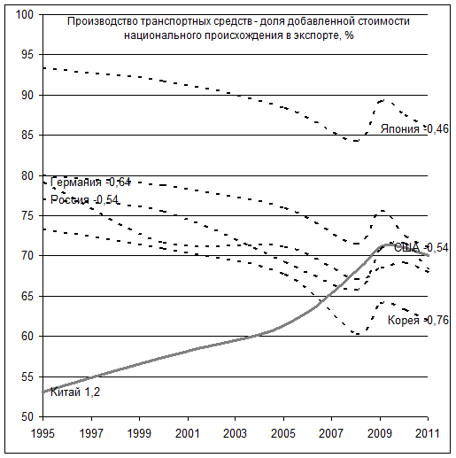 К примеру, Китай смог добиться столь продолжительного экономического роста благодаря постоянному повышения уровня локализации в экспорто-ориентированных отраслях (см. рис. 5).