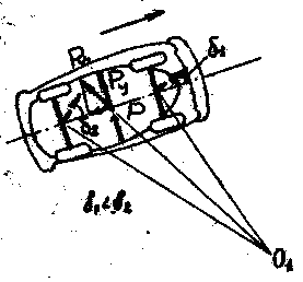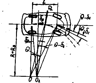 Рис. 3.11. Схема поворота автомобиля с эластичными шинами.