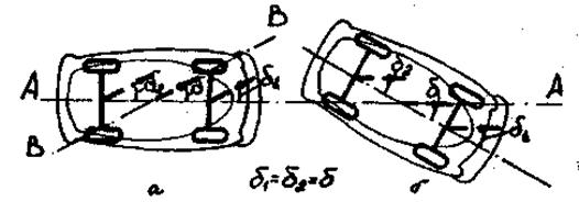 Автомобиль, имеющий нейтральную поворачиваемость, будет в результате увода двигаться также прямолинейно, но под углом к прежнему направлению движения (рис. 3.12, а), т. е. по линии ВВ.