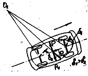 (рис. 3.14.), вследствие чего увод увеличивается. Это приводит к дальнейшему увеличению центробежной силы, и, если водитель не повернет передние колеса в противоположную сторону, автомобиль начнет двигаться по кривой непрерывно уменьшающегося радиуса, что может вызвать занос или опрокидывание автомобиля.