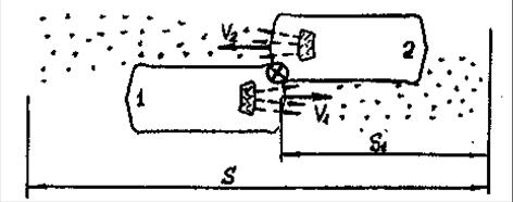 При встречных столкновениях место удара в продольном направлении может быть приближенно определено исходя из расположения дальних границ участков рассеивания осколков стекол, отброшенных от каждого из столкнувшихся ТС в направлении его движения. При аналогичном характере разрушения однотипных стекол максимальная дальность отброса осколков при их перемещении по поверхности дороги прямо пропорциональна квадратам скоростей движения ТС в момент столкновения. Поэтому место столкновения будет находится от дальней границы участка рассеивания осколков стекол первого ТС на расстоянии