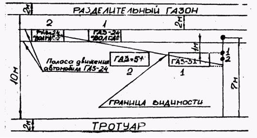 После этого на схему наносят положение автомобиля ГАЗ-24 «Волга» на расстоянии остановочного пути от места наезда, соответствующие положения автомобиля ГАЗ-51, пешехода (положение 2 на схеме) и определяют границу видимости. Она проходит через точку, соответствующую положению водителя и автомобиля ГАЗ-24 «Волга», и левый передний угол автомобиля ГАЗ-51. Согласно построенной схеме автомобиль ГАЗ-51 не ограничивал видимости пешехода водителю автомобиля ГАЗ-24 «Волга», в тот момент, когда последний находился от места наезда на расстоянии