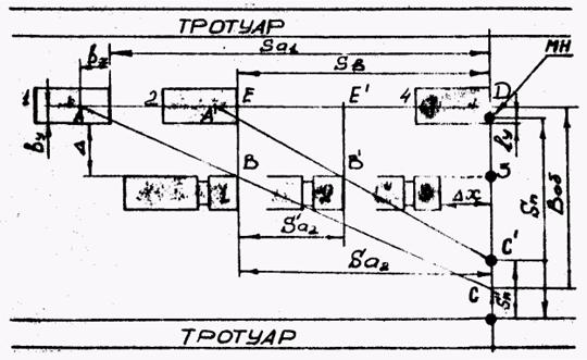 После нанесения положений автомобиля А и автомобиля Б на схему, составленную в масштабе, методом подбора находится такое положение, по которому устанавливается граница видимости или «невидимой зоны».