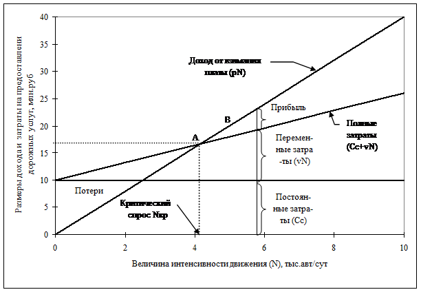 утолщенная линия, проходящая параллельно оси абсцисс, характеризует постоянные затраты, связанные с оказанием дорожных услуг. Выше ее и под углом расположена линия переменных затрат, которые принимаются пропорциональными платежеспособному спросу на проезд по дорожному сооружению. Линия дохода от платы за проезд начинается с нуля и стремится вверх по мере увеличения интенсивности движения по платному дорожному объекту. С помощью этого графика можно решить две задачи: прямую и обратную.