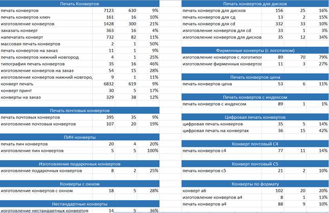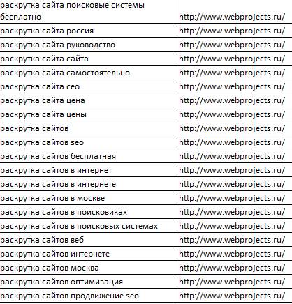 Когда мы составили ядро из нескольких сотен или тысяч запросов, начинается самый интересный и трудоемкий процесс – группировка запросов и создание списка соответствия страниц запросам. Вот как примерно выглядит список соответствия: