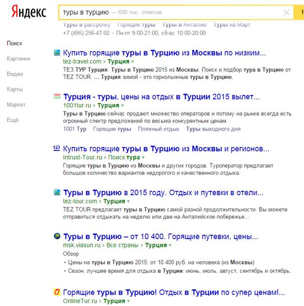 Допустим, большинство оптимизаторов скажут вас, что запрос «туры в турцию» нужно распределить на главную страницу сайта. Действительно, запрос сложный и высоко конкурентный. Однако, если мы зайдем в Яндекс и осуществим проверку, то увидим, что в выдаче по этому запросу в основном не главные страницы, а внутренние: