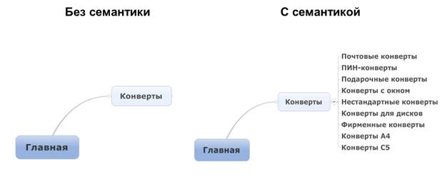 На схеме слева представлена структура сайта без семантики (это 99% всех сайтов) и структура сайта, которая была создана после анализа и сбора семантики (это 1% всех сайтов).