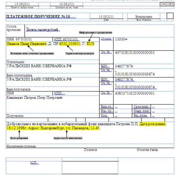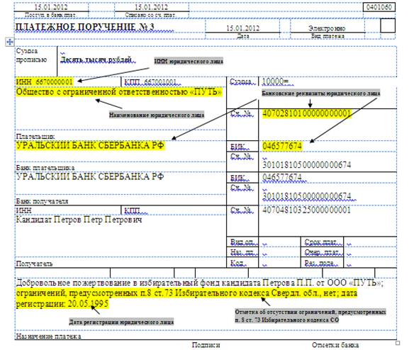 - От юридических лиц: идентификационный номер налогоплательщика, наименование, дата регистрации, банковские реквизиты, отметка об отсутствии ограничений предусмотренных пунктом 8 статьи 73 Кодекса. При этом непосредственно в поле «Назначение платежа» платежного поручения делается следующая запись: «Добровольное пожертвование в избирательный фонд кандидата (ФИО кандидата), избирательного объединения (наименование избирательного объединения); ограничений, предусмотренных п. 8 ст. 73 Избирательного кодекса Свердловской области, нет; дата регистрации (в формате: дд, мм, гггг)».