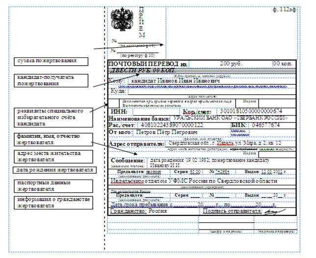 Распоряжение о переводе денежных средств в полном объеме в оплату стоимости печатной площади, предоставляемой кандидату, передается в филиал Сбербанка кандидатом, уполномоченным представителем кандидата по финансовым вопросам, как правило, не позднее чем за два дня до дня предоставления печатной площади. Копия платежного документа с отметкой филиала Сбербанка предоставляется кандидатом, уполномоченным представителем кандидата по финансовым вопросам в редакцию периодического печатного издания до предоставления печатной площади.