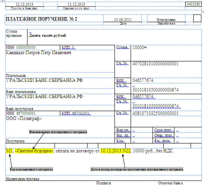 Безналичные расчеты кандидатов с физическими и юридическими лицами за изготовление, а также распространение каждого тиража печатного, аудиовизуального или иного агитационного материала производятся отдельными платежными поручениями.
