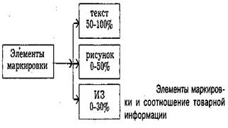 Текст как форма письменной информации — наиболее распространенный элемент производственной и торговой маркировок. Рисунок не всегда присутствует на маркировке. В наибольшей степени он присущ производственной маркировке, в наименьшей — торговой. Условные обозначения, или информационные знаки (ИЗ), характерны в основном для производственной маркировки. В товарной маркировке они встречаются реже. |