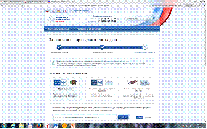 9. После завершения проверки личных данных требуется ОБЯЗАТЕЛЬНО получить подтвержденную учетную запись. Эта процедура предусматривает ввод на сайте персонального кода подтверждения. Для получения кода подтверждения необходимо обратиться лично в многофункциональный центр (МФЦ). МФЦ есть в каждом районе Новгородской области.