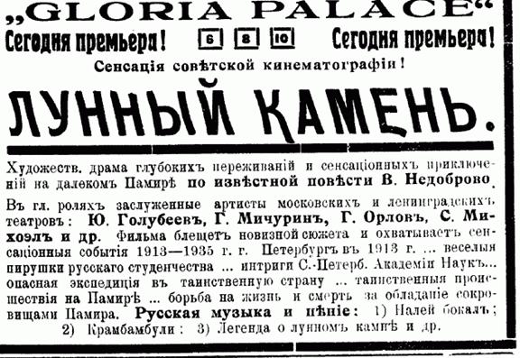 –– Кинотеатр “Gloria Palace”. Начало демонстрации советского фильма «Лунный камень» (другое название «Памир», Ленфильм, 1935, реж. А. Минкин, И. Сорохтин). Приключения на далеком Памире по сценарию В. Недоброво. В ролях Ю. Толубеев, Г. Мичурин, Г. Орлов, С. Михоэлс и др. Рус. музыка, пение «Налей бокал», «Карамбамбули», «Легенда о лунном камне» и пр. (ВД. 1936. 18 июня. № 000. С. 1).