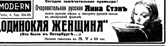 –– Кинотеатр «Modern» (S. Tartu, 4). Показывалась картина из рус. жизни с Анной Стэн () «Одинокая женщина» (Это было в Петербурге..., A Woman Alone, 1936). (ВД. 1936. 6 окт. № 000. С. 1; 7 окт. № 000. С. 2; 10 окт. № 000. С. 1).