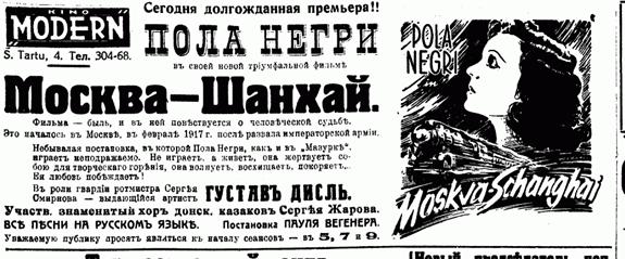 19 ноября. –– Кинотеатр “Modern” (Tartu mnt, 4a). Состоялась премьера романтической мелодрамы Пауля Вегенера «Москва-Шанхай» (киностудия Oreon, 1936) с участием Пола Негри и хора донских казаков под руководством Сергея Жарова. (ВД. 1936. 19 нояб. № 000. С. 1; 20 нояб. № 000. С. 2).