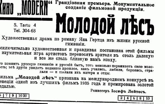 –– Кинотеатр “Modern”. (Suur Tartu, 4). Фильм по роману Яна Гертца из жизни рус. гимназии «Молодой лес», лауреат Венецианского кинофестиваля 1935 г. Реж. Иосиф Лейтес. (ВД. 1936. 15 февр. № 38. С. 1).