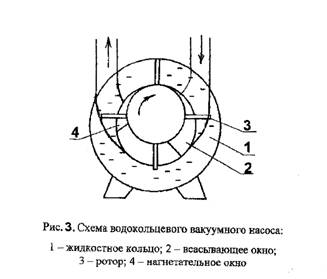 Достоинством водокольцевых насосов является отсутствие трущихся деталей и малый уровень шума. Указанные достоинства обеспечиваются принципом их работы. Схема водокольцевого вакуумного насоса приведена на рис. 3. При вращении рабочего колеса насоса образуется жидкостное кольцо 1, которое под действием центробежной силы прижимается к внутренней поверхности корпуса. Вследствие эксцентричного расположения рабочего колеса жидкостное кольцо отходит от втулки ротора, увеличивая рабочий объем, в который через всасывающее окно 2 всасывается воздух. Ячейка, образуемая внутренней поверхностью втулки ротора и лопатками 3, увеличивает свой объем до определенной величины угла поворота колеса. При этом происходит процесс всасывания. При дальнейшем повороте рабочего колеса начинается сжатие воздуха за счет уменьшения объема ячейки. При достижении в ячейке заданного давления (при повороте колеса на определенный угол) ячейка сообщается с нагнетательным окном 4, через которое сжатый воздух вытесняется в нагнетательную полость и выходит из машины.
