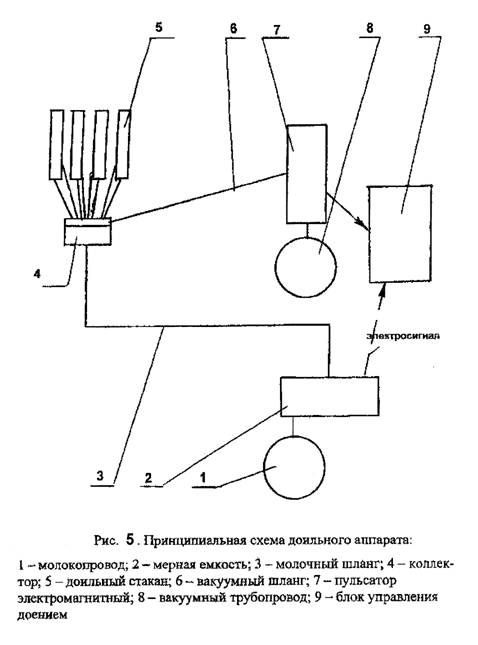 Основными узлами молочной системы доильной установки являются доильные аппараты, молочный трубопровод, молокоприемник, автоматы додаивания и механизмы снятия аппаратов. Каждый доильный аппарат (рис 5) состоит из четырех доильных стаканов, коллектора, пульсатора, молочного и вакуумного шлангов, мерной емкости.