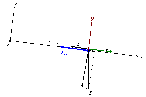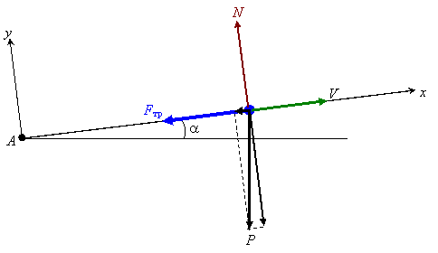 1. Рассмотрим движение вагона на первом участке АВ. Изображаем его на рисунке (в виде точки) в текущем (промежуточном положении). Указываем все действующие на вагон силы – это сила трения, Fтр, направленная против вектора скорости V; сила тяжести Р, направленная вертикально вниз; нормальная реакция N, направленная перпендикулярно рельсам (линии АВ). Строим декартову систему координат Аху, взяв начало в начальном положении вагона и проведя ось Ах по АВ.