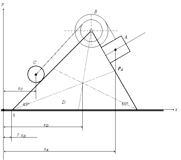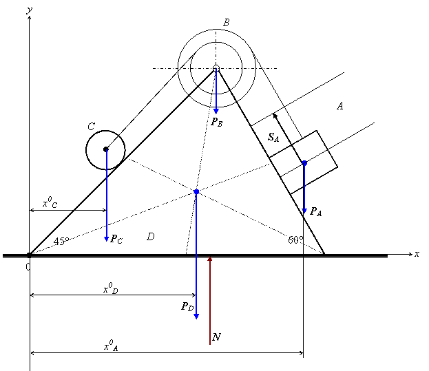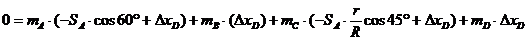 0 = 9×(–1×cos60° + ∆xD) + 3×∆xD + 19×(–1×cos45°×40/60 + ∆xD) + 59×∆xD