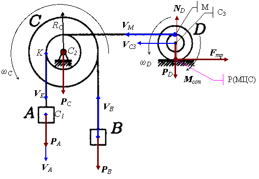 – скорость точки К блока С – VK = VA = VM (так как нить нерастяжимая);