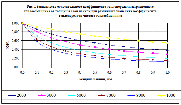 На рис.1 представлены графики зависимости относительной тепловой эффективности загрязненного теплообменного аппарата от толщины слоя накипи при различных значениях коэффициента теплопередачи чистого теплообменника (коэффициент теплопроводности накипи принят 1,2 Вт/(м2 . 0С)).