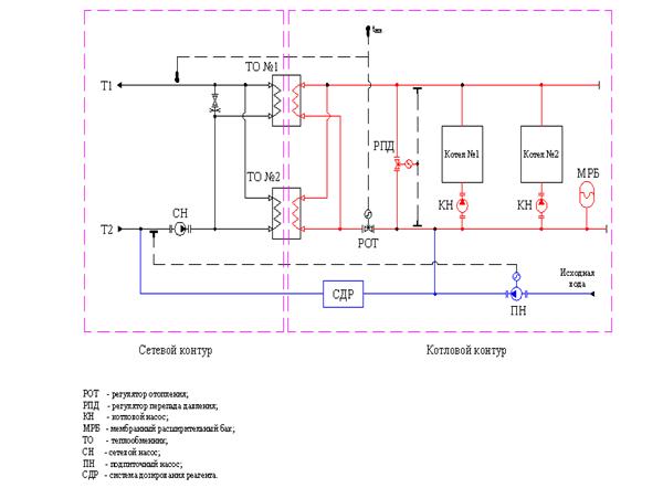Внутренний (котловой) контур заполнен химически очищенной водой с жесткостью не более 200 мкг-экв/кг. При отсутствии утечек во внутреннем контуре и исправной работе системы компенсации температурных расширений, выполненной на базе мембранных расширительных баков (МРБ), подпитка контура практически не требуется, что обеспечивает отсутствие накипеобразования и коррозии на поверхностях нагрева котлов и теплообменников (со стороны котлового контура).