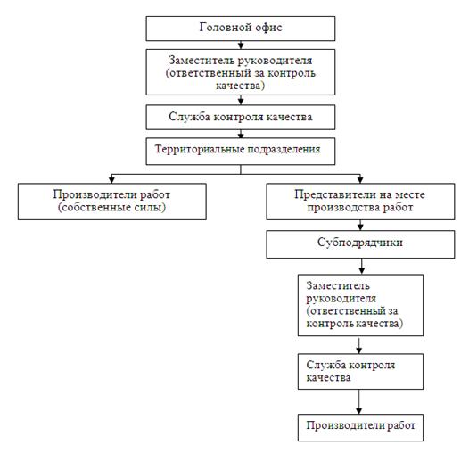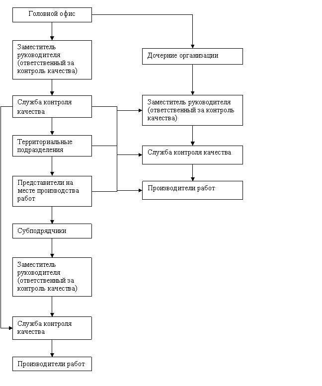 а) систему взаимодействия при проведении контроля качества строительно-монтажных работ между Головным офисом с подведомственными звеньями, субподрядными организациями, характеризующие порядок контроля качества СМР по всем применяемым его формам (инспекционный, документарный и т. д.): периодичность, ответственные лица, должностной уровень и т. д.;