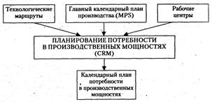 Метод планирования потребности в производственных мощностях (CRP) нацелен на улучшение использования производственных мощностей рабочих центров (оборудования, поточных линий, бригад рабочих и т. п.). Система выполняет планирование и балансировку загрузки рабочих центров с учетом ресурсных ограничений и планов выпуска готовой продукции. На рис. 2 приведена функциональная структура CRP-систем. Планирование потребности в производственных мощностях осуществляется по каждому виду продукции включенному в главный календарный план. При планировании учитывается последовательность выполнения технологических операций изготовления продукции на рабочих центрах.