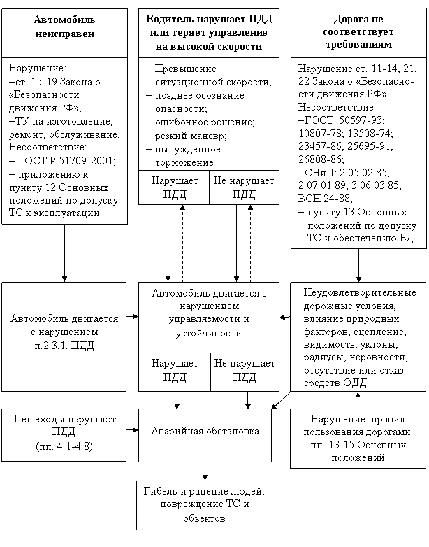 На рис. 3 показаны такие причинно-следственные связи ДТП с замыканием на создание аварийной обстановки, которая приводит к ДТП с указанными последствиями. Так, вследствие несоответствия технического состояния автомобиля требованиям безопасности его движение не соответствует конкретно требованию п.2.3.1 ПДД, что может привести к нарушению управляемости и устойчивости с созданием аварийной обстановки из-за потери водителем управления. Аварийная обстановка может возникнуть и при исправном автомобиле из-за сознательного нарушения ПДД водителем, по его неосторожности или вследствие ошибочных решений и действий, когда дефицит времени и расстояния не позволяют прекратить движение или совершить безопасный маневр, т. е. также происходит неуправляемое движение автомобиля.