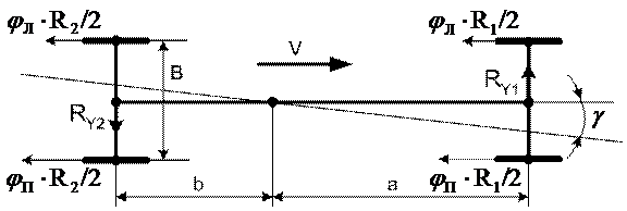 Следует отметить, что в п.10.1 ПДД водитель в случае опасности «…должен принять возможные меры к снижению скорости вплоть до остановки ТС». Но в условиях большой неравномерности сцепления по левым и правым колесам при экстренном торможении без АБС нарушается устойчивость, возникают разворот продольной оси ТС и складывание автопоезда. Из-за блокирования колес практически исчезает способность создания в зоне их контакта с дорогой боковых реакций [10,14,15 и др.]. По схеме начала разворота двухосного автомобиля (рис. 7) уравнение моментов относительно центра масс выглядит следующим образом: