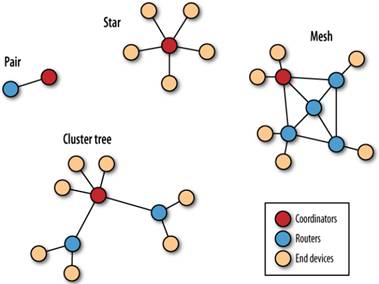 Сенсорные сети поддерживают топологии типа точка-точка, звезда, кластерное дерево и MESH (ячеистая сеть) (Рис. 1).