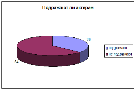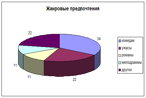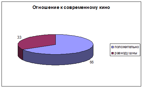 Все опрошенные относятся к современному кино положительно и смотрят его с удовольствием. Многие, как я и предполагала в своей гипотезе, подражают актерам, но только в положительных моментах, а именно в умении одеваться, следить за собой, подражать образу и внешности, но без фанатизма, некоторые признались, что любят цитировать актеров. Предпочтений каким-то особенным жанрам нет и разброс невелик, это комедии и ужасы. Зато все, за исключением нескольких человек, отдают предпочтение зарубежному кино, т. к. считают, что оно ярче и красивее, а наше кино еще не очень хорошее и цитирую одного из респондентов: «Не научились в России снимать качественное кино. Есть хорошие идеи и сюжеты, но очень плохо поставлены и нет желания его смотреть». Многие смотрят кино для того чтоб «убить» время - « Кино люблю бесконечно. Ибо кино смотреть время убивать» (см. диаграммы 1-3).